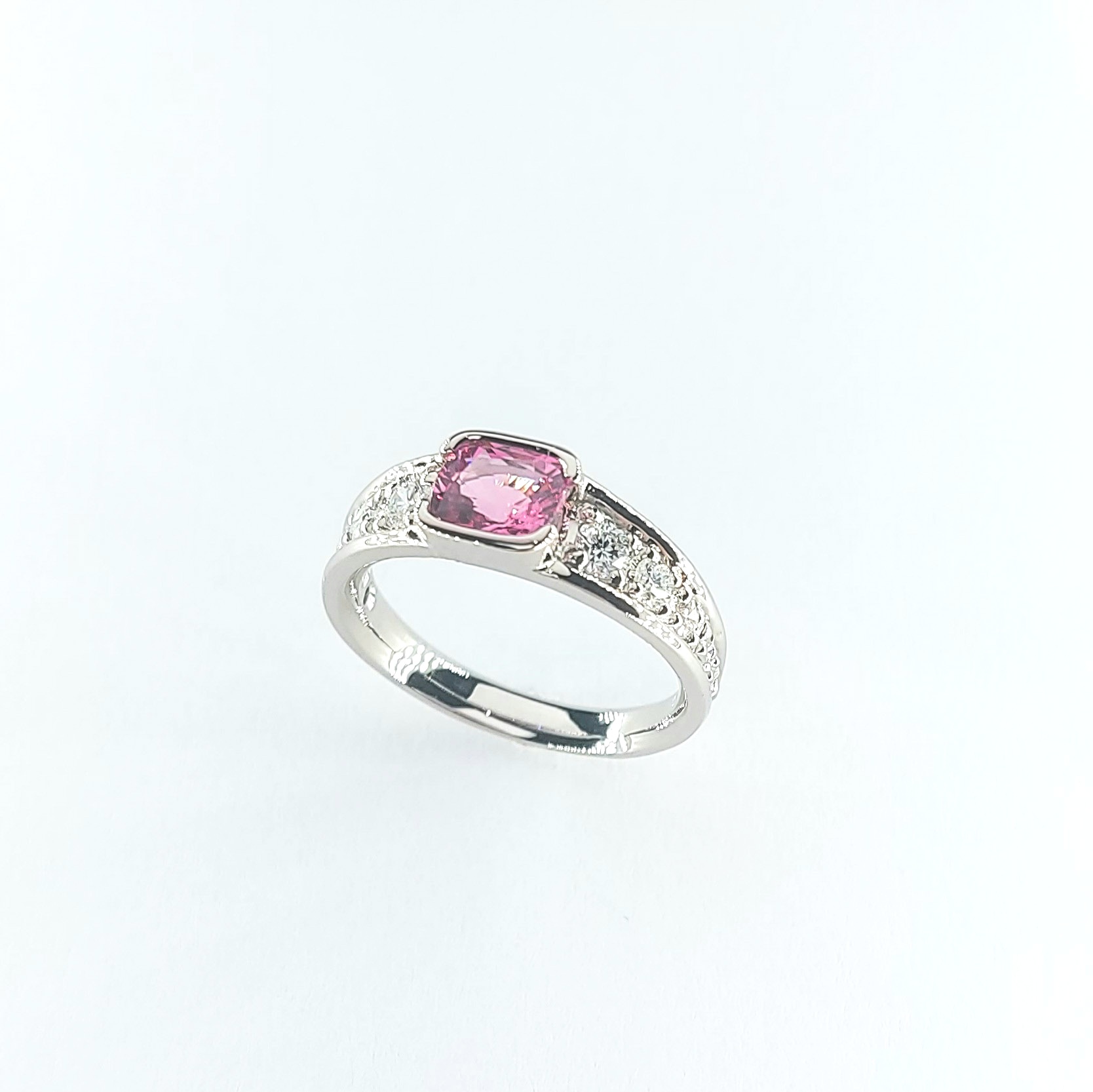 Spinelle rose coussin 6x5.50mm et 10 diamants Fvs 0.50cts au total